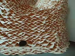 (6000) An arched shelf bolsters 6000 small sheets of thin, transparent plastic. Hundreds have already been painted, revealing that they exist as an assemblage of tiles that, when properly arranged, mimic their parent image. Fischer will paint the remaining sheets on demand as they are requested and will continue this practice alongside his other projects.